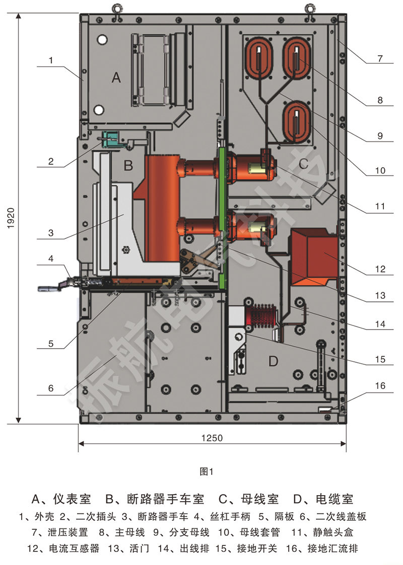 開(kāi)關(guān)設(shè)備由斷路器手車(chē)室、母線室、電纜室、儀表室組成。
